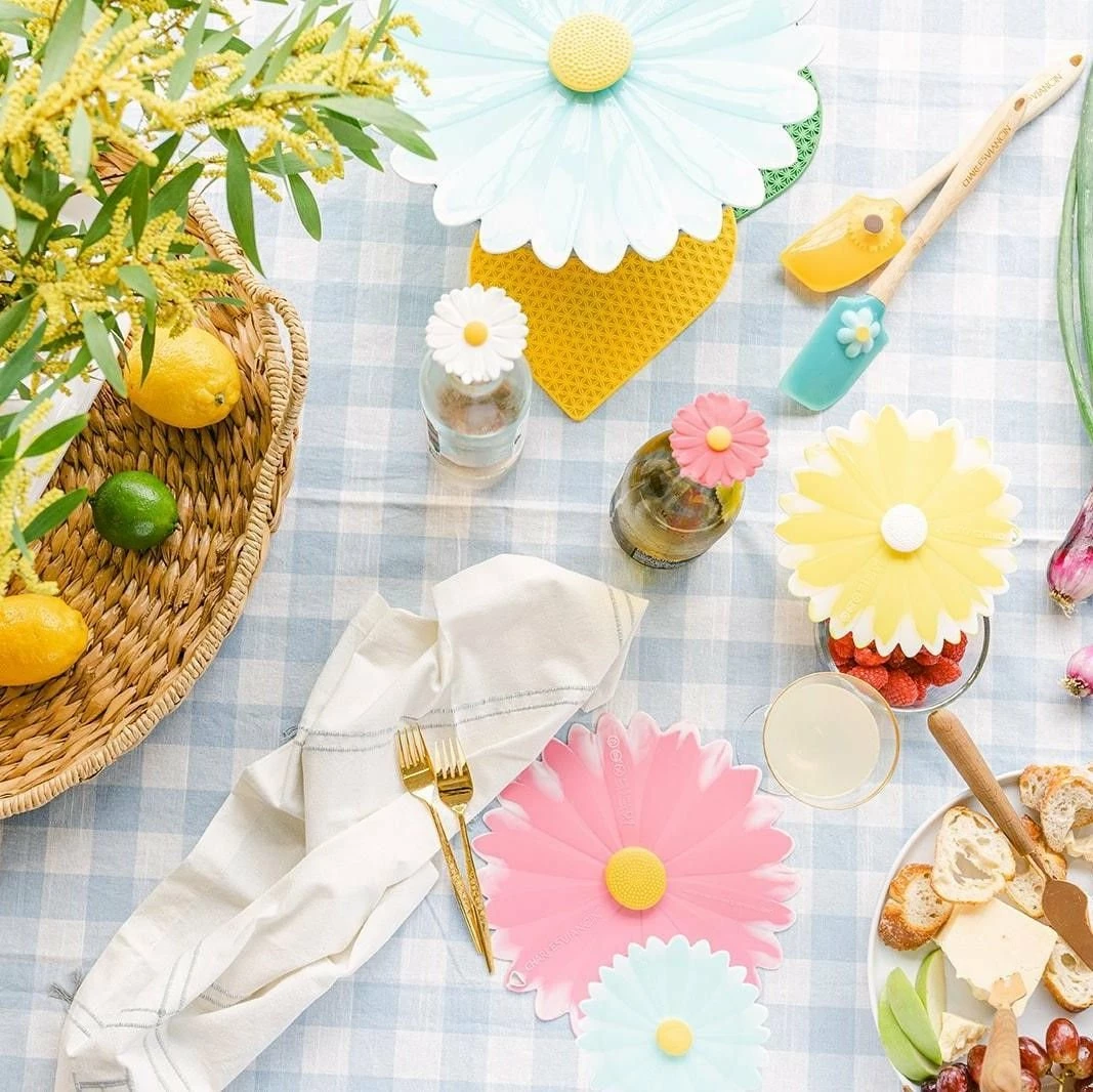 The Charles Viancin White with Pink Daisy 9” Silicone Lid is the perfect multi-use lid for storing food and containing splatter while cooking! This BPA-free universal food cover creates an airtight suction seal and is microwave, freezer, dishwasher, and oven-safe up to 428°F. When used while cooking or reheating food, this heat-resistant lid locks in moisture and prevents splatter, making it great for frying, simmering soups, steaming vegetables, and more! When used to store fresh fruits, vegetables, and other food in the fridge or freezer, it keeps air out and prevents freezer burn to keep your food fresh and ready to enjoy. Perfect for use with any round-rimmed baking dish, saucepan, fry pan, bowl, or container, the Charles Viancin reusable Daisy Lids will help you save money on single-use plastic wrap or aluminum foil and will quickly become one of your favorite kitchen tools!
