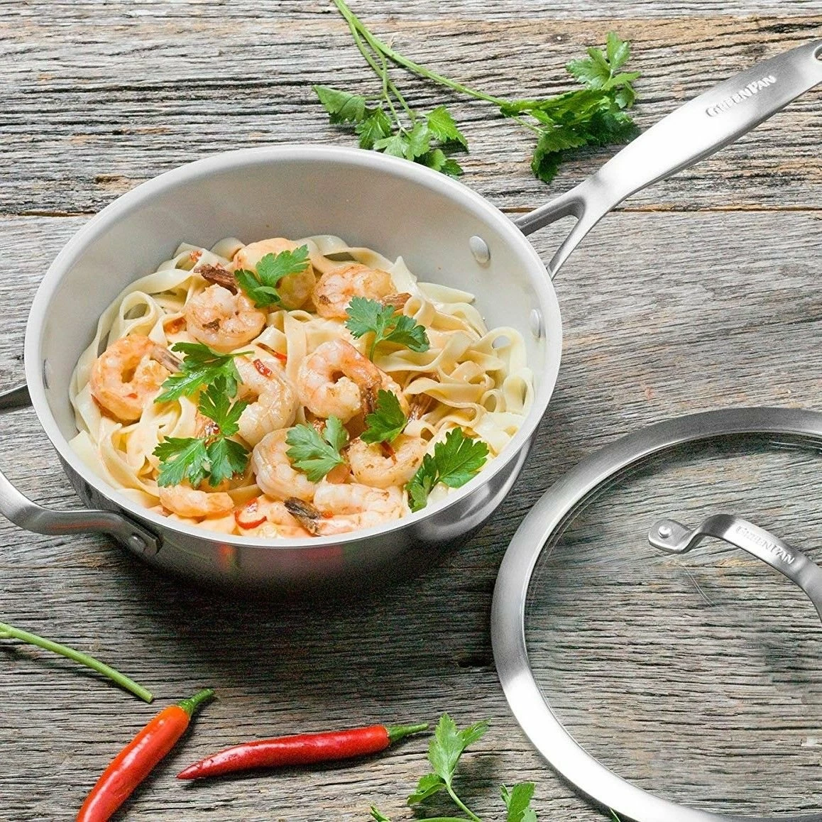 Steam veggies, cook homemade sauces, or braise tender, juicy meats with the Venice Pro Evershine™ 3.6-Quart Chef’s Pan by GreenPan! From the pioneers who created the first 100% healthy ceramic nonstick frypan on the market, the Venice Pro Collection features pristine, tri-ply stainless steel cookware that’s been treated with Evershine™ – a toxic-free, electro-chemical treatment that’ll prevent your pan from discoloration or tarnishing, even after years of use. Featuring stainless steel handles and trimmed edges for a sleek look, this pan is finished with GreenPan’s Thermalon Minerals nonstick coating that allows you to use less oil when frying and makes cleanup a breeze! This pan comes with a sturdy glass lid and features a flat base and flared, rounded sides, making it perfect for sautéing, searing, browning, frying, and more! Plus, it’s grill-safe, dishwasher-safe, oven-safe up to 600°F, and safe for use with metal utensils, giving you ultimate cooking versatility. For truly stainless steel cookware that’ll remain bright, beautiful, and looking like new after years of use, try the Venice Pro Collection by GreenPan today!