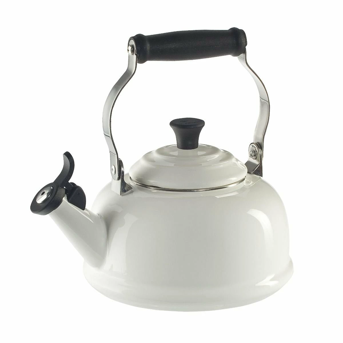 Whether you are preparing a soothing cup of tea, gourmet French press coffee, or a bowl of heartwarming oatmeal, this Le Creuset Classic 1.8 Quart Whistling Kettle in White will serve your hot water needs in style. This stylish whistling kettle features a single-tone whistle alert when water has reached a rolling boil so you’ll know, even in a different room, when your hot water is ready to pour.