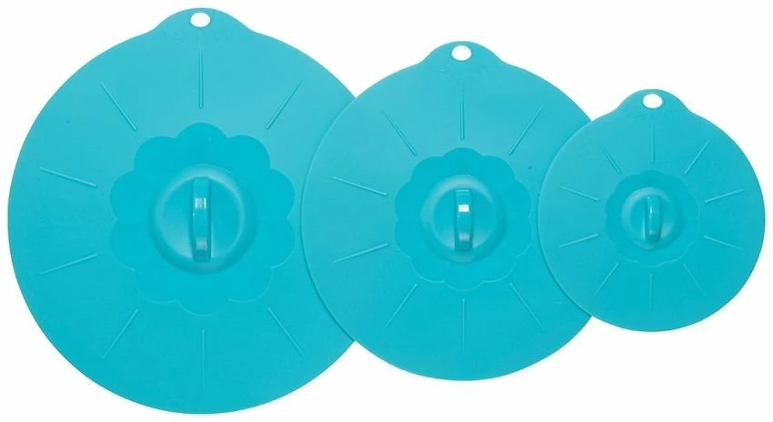 Say goodbye to buying expensive plastic wrap! No more struggle to cut the right sized pieces to fit your bowls. When you use this 3 piece set of Silicone lids, you will find them well suited to many different sized bowls, pots, and skillets. Great for pots and pans with no lids. This set includes 3 lids sized at 5.5”, 8” and 9.5”. For use simply press the center, then to gently lift any side to release. The flexible Silicone material forms a no-spill airtight seal that will keep your food fresh during storage. The blue silicone lid set of 3 offers an eco-friendly option ending your struggle with finding lids that fit!