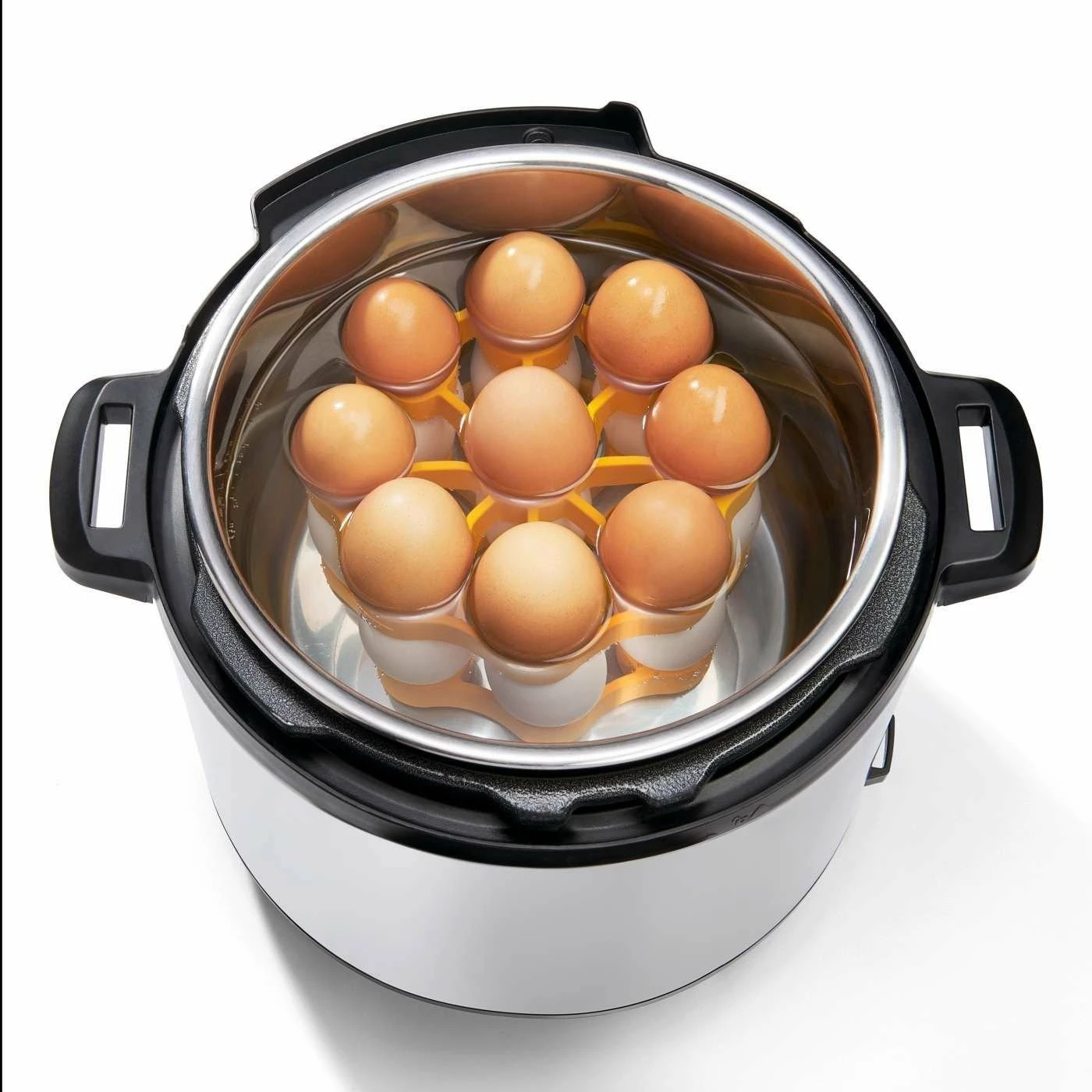 Eggs comin’ right up! Rack ‘em on top and boil ‘em right side up while sitting on this Good Grips Silicone Pressure Cooker Egg Rack by OXO. Safe for food, the food-grade silicone is durable for daily use, and is wrapped in an attractive yellow finish. Steady but surely, the heat-resistant egg rack holds up to 9 eggs as they cook to snacking or dining perfection, every time – and the shells peel off quite easily. Not just a pressure cooker, no, the Oxo egg rack also acts as a very nice trivet, on occasion. Feel free to use it after decorating those hard-boiled eggs for a vibrant and colorful display on your countertop or table top. A simple shape, the rack makes for quick and easy cleanup. Hot off the OXO Good Grips Silicone Pressure Cooker Egg Rack comes delicious batches of hard-boiled eggs perfect for holidays, mealtime, and snacking – so get cracking!
